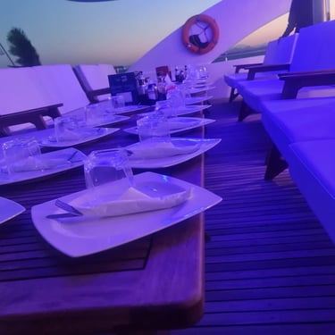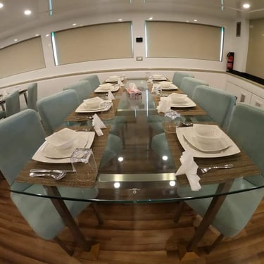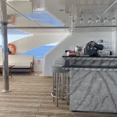 Saloon: Dining area and bar. TV, DVD player, Stereo system.